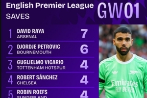 以下为英超首轮扑救次数top10: