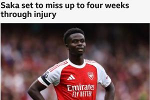 萨卡在阿森纳5-0战胜利兹联的比赛中因腿筋受伤离场,预计将伤缺4周,无缘对阵利物浦的比赛,以及下月英格兰的世预赛。