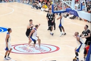 在本场比赛中,周鹏因对手防守赵睿动作过大,挥拳直接把赫罗纳男篮的14号干翻。