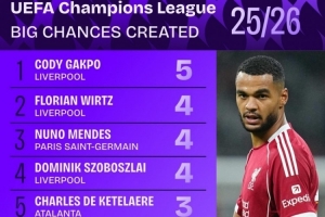据Squawka统计,加克波本赛季欧冠创造5次重大机会,多于其他参赛球员。